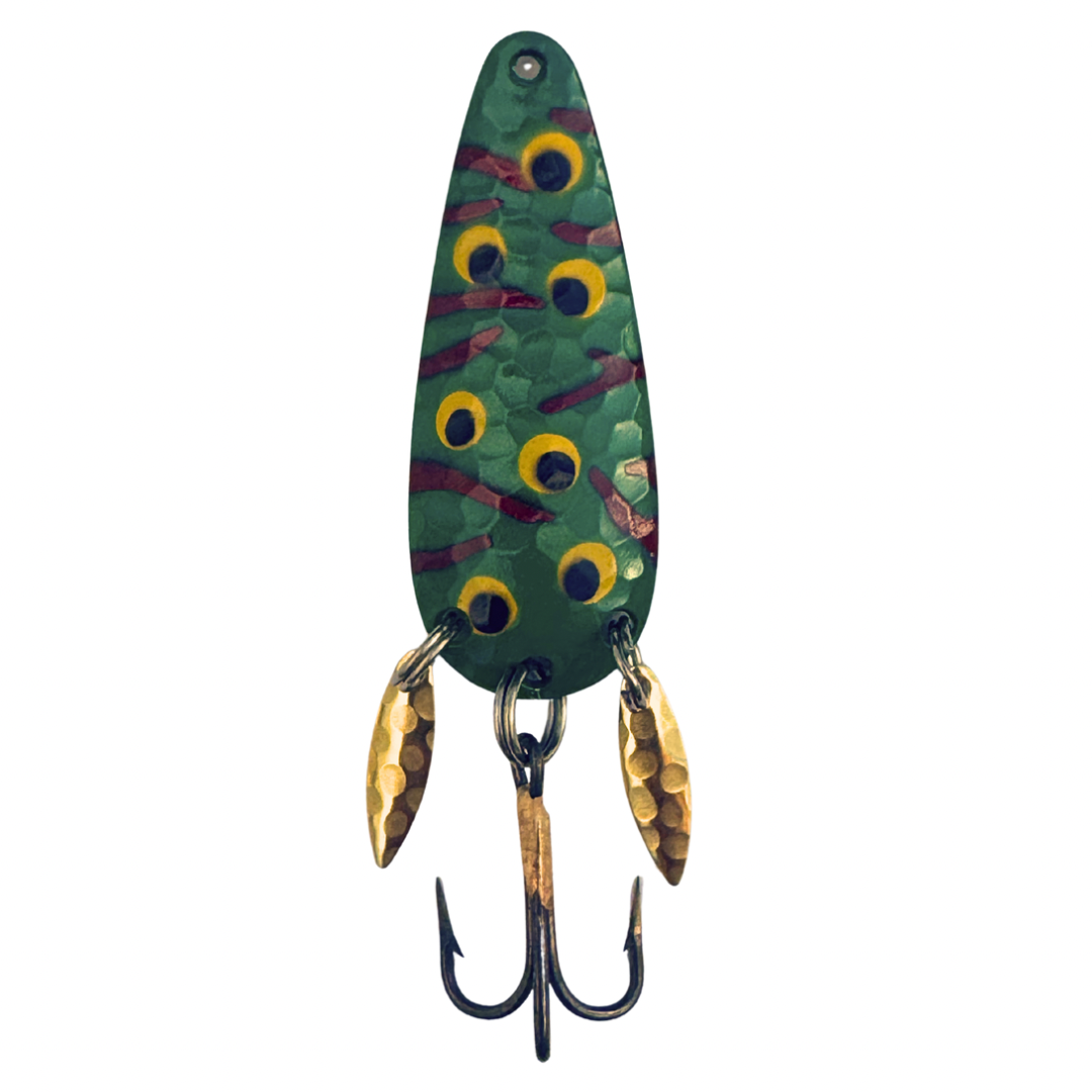 The Mook lure's spoon is 2.5” long and the total weight is 2/5oz or 13 grams. Perfect for trolling and casting.